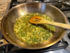 While the yeast is proofing, heat the olive oil in a small saucepan over low heat. Once warm, add the minced garlic and chopped rosemary. Sauté gently for about 5 minutes, ensuring the garlic and rosemary do not brown. Remove from heat and let the mixture cool to room temperature.