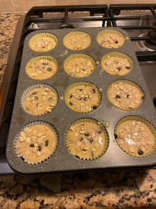 Pour the wet mixture into the dry ingredients. Still gently until just combined. Don’t overmix as that can make muffins dense.